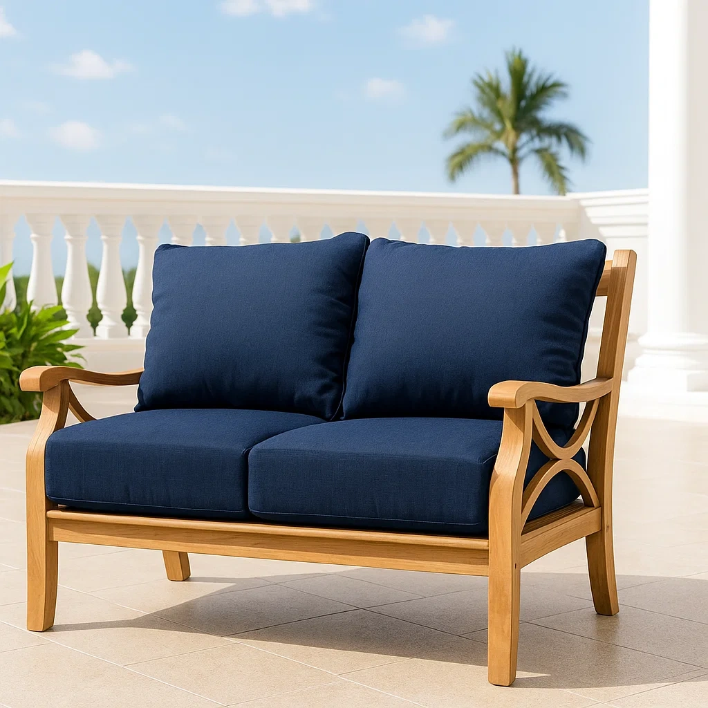 Banquette d’extérieur 132 x 87 x 89 cm bleu foncé/bois clair teck/tissu oléfine